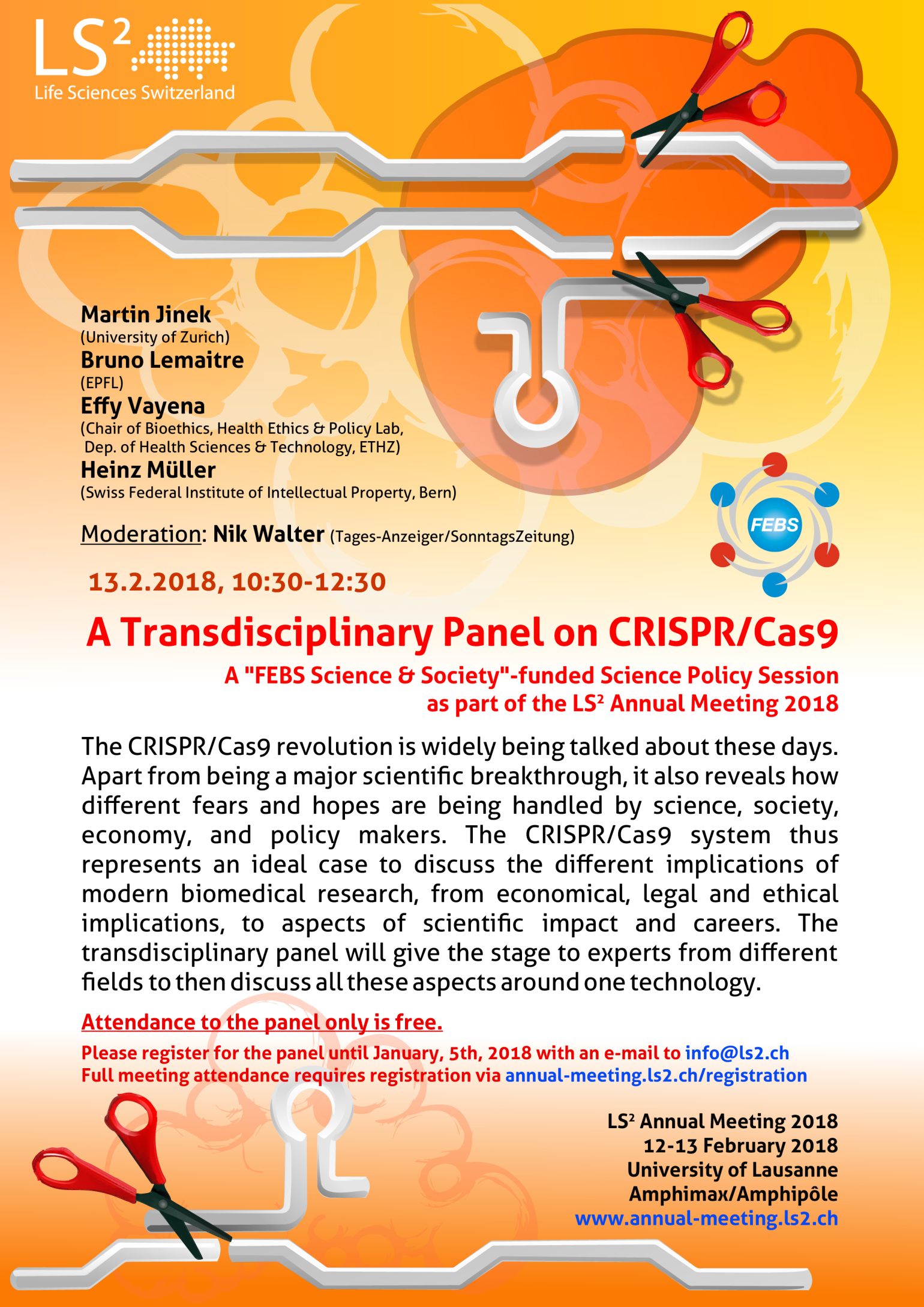 The CRISPR/Cas9 revolution is widely being talked about these days. Apart from being a major scientific breakthrough, it also reveals how different fears and hopes are being handled by science, society, economy, and policy makers. The CRISPR/Cas9 system thus represents an ideal case to discuss the different implications of modern biomedical research, from economical, legal and ethical implications, to aspects of scientific impact and careers. The transdisciplinary panel will give the stage to experts from different fields to then discuss all these aspects around one technology.
